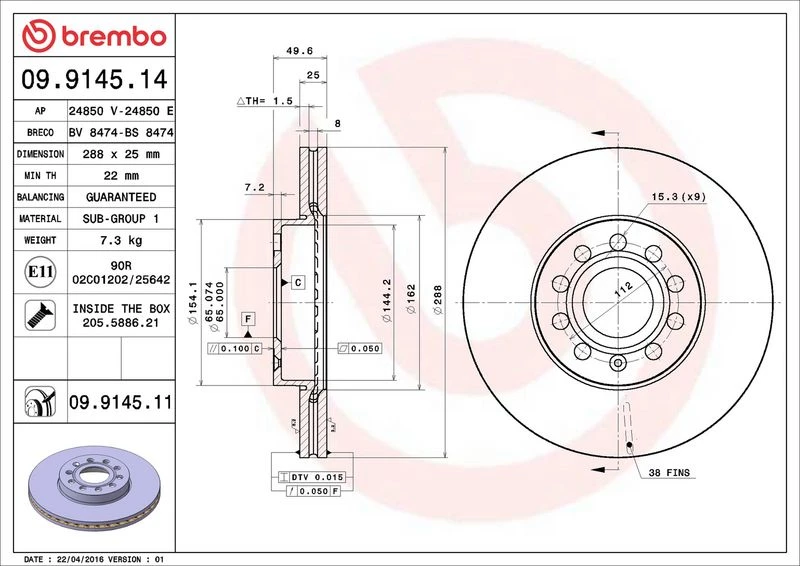 | Outer diameter (mm) | 288 |