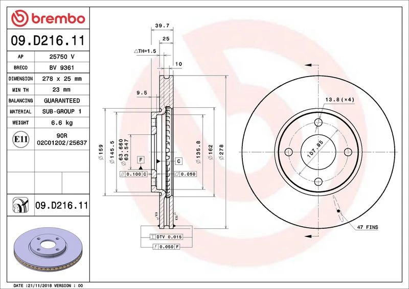 | Outer diameter (mm) | 278 |